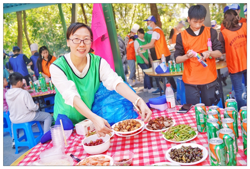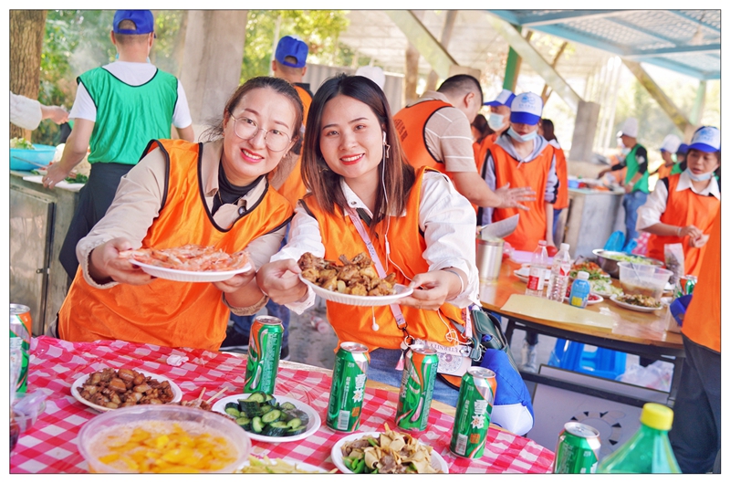 由于只有9个锅灶,适才在“老虎-大象-老鼠”小游戏争得面红耳赤的一对对手瞬间又成了友爱可亲的“战友”,大家烧火的烧火,洗菜的洗菜,帮厨的帮厨,掌勺的掌勺,帮不上忙的员工就在饭桌上画队旗,每个人都各司其职。术业有专攻,有的小组藏有“大厨”,不一会儿功夫就倒腾出六菜一汤,一时间菜香四溢,勾得旁边其他小组的员工馋虫直爬。各个小组一番匆忙做好菜式后,李铁军总、李卫魏主任和几个摄影师组成了美食评委小队,挨个巡视、品尝菜式,忍不住对大家的手艺赞不绝口。