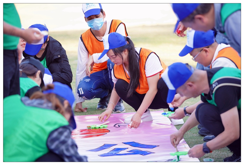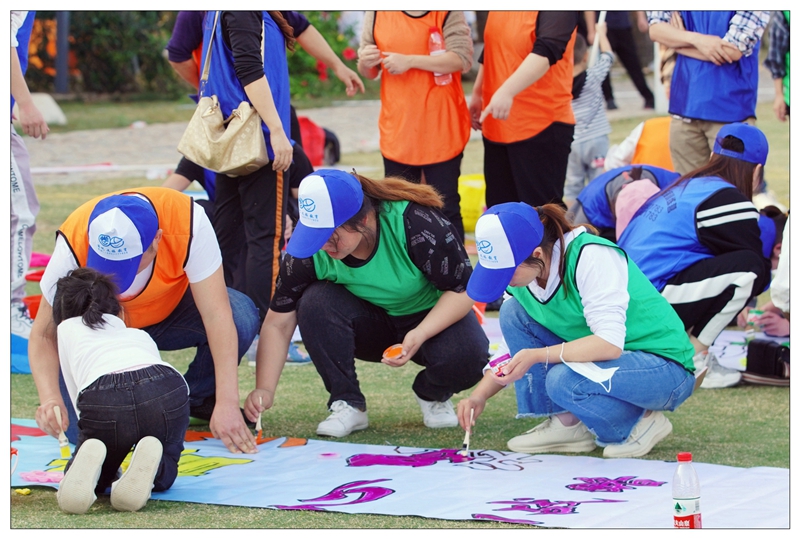 短暂休息后,教练们抬来了八幅横条,18个小组再次被打乱,分成了8个小组,每个小组领到了一幅横条。大家展开一看,原来是一整块企业文化背景布被分成8块,中间的文字、字母和物体都是空心体,教练要求大家将8块拼图拼成一个完整的“纳斯卡巨画”,还要求将支离的相邻空心体涂成同一颜色。这是对团队凝聚力的巨大考验,所有人都要参与,一笔一划勾勒出完整体的一部分,没有通盘统筹,没有大格局思维,没有令行禁止的执行力,这是不可能完成的任务。