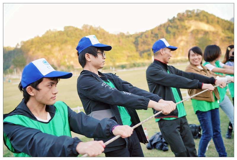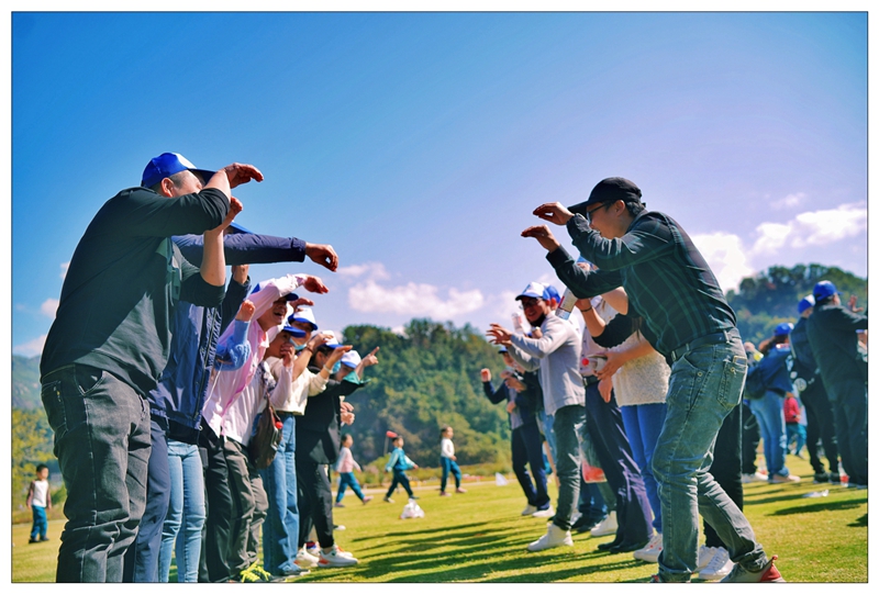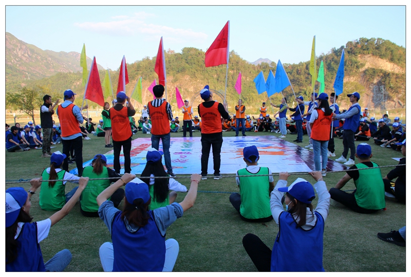 经过大半天的团建活动,大家不免有一些疲劳,但真正面对有挑战性的活动时,精神顿时充满了能量,在短暂的热身之后,无论教练发出什么样的号令,大家都丝毫无差的加以执行,让人不免对这支大团队感到由衷的钦佩和感动。教练决心加大难度,将18名队长抽调出来,各人手握本队的队旗在中圈摇旗呐喊,然后又抽调一些体型与轻重不一的员工站在绳圈上走上足足两圈,这一下子大大增加了握住绳圈员工的压力,大家不得不咬紧牙关,采取通力合作和责任分担方式,终于圆满地完成了教练指定的各项挑战。