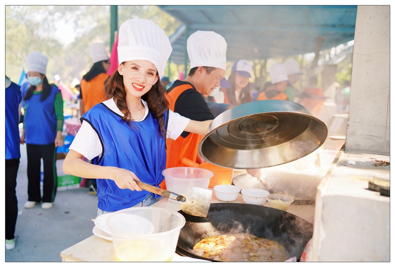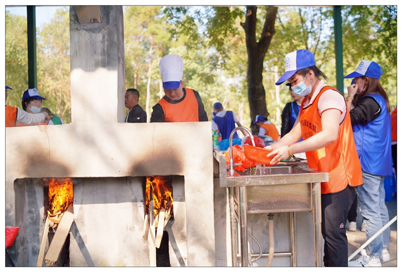 由于只有9个锅灶,适才在“老虎-大象-老鼠”小游戏争得面红耳赤的一对对手瞬间又成了友爱可亲的“战友”,大家烧火的烧火,洗菜的洗菜,帮厨的帮厨,掌勺的掌勺,帮不上忙的员工就在饭桌上画队旗,每个人都各司其职。术业有专攻,有的小组藏有“大厨”,不一会儿功夫就倒腾出六菜一汤,一时间菜香四溢,勾得旁边其他小组的员工馋虫直爬。各个小组一番匆忙做好菜式后,李铁军总、李卫魏主任和几个摄影师组成了美食评委小队,挨个巡视、品尝菜式,忍不住对大家的手艺赞不绝口。