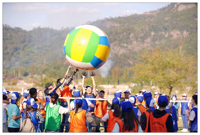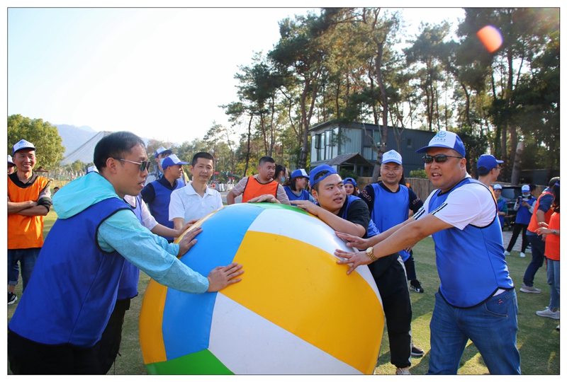 吃完自己动手做出的大餐之后,下午的团建“大餐”也如约而至,首先就是一场“惊心动魄”的超级排球大赛。平常的排球比赛,用球直径不过20厘米,重量不足350克,满打满算两边合计10人,而我们这次打的是“巨型”排球大赛——球体直径超过1米,重量1公斤左右,最不同的是参与人数——18个小组合而为二,每一队都有数百人。