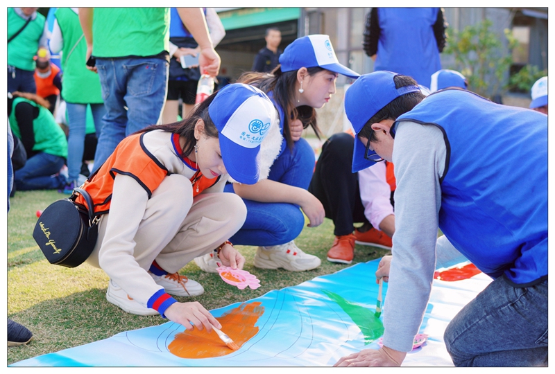 8个小组迅速行动起来,不再各自为战,联络员来回穿梭,沟通来自其他小组的重要情报,表面是8个团队,从过程上看是一个团队的8个组成部分,密不可分。不得不说,可爱的圣普人不仅完成得很好,而且充分展示了艺术天赋,五颜六色的彩笔经由几百多人的涂画,整个背景布不仅不显得凌乱无章,反而既规整又活泼,妙处横生。