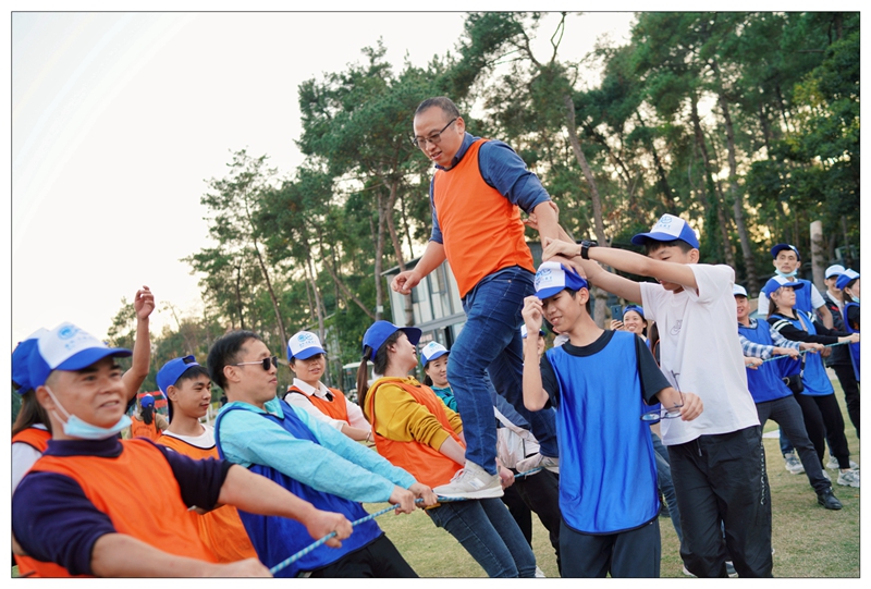 时过下午4点,团建活动的最后一道大餐——动力绳圈如约而至,相比前面几个大小游戏,动力绳圈明显难度更高,也更吃体力。所有员工再次合而为一,形成里外两个大圈,每个人都伸出双手握住绳圈,无论是向上提、向下压,还是往前推、往后拉,都必须步调一致、动作一致、口号一致,可以说如果有一丝不契合,大部分往前推而小部分人往后拉,这个挑战活动就玩不下去了。